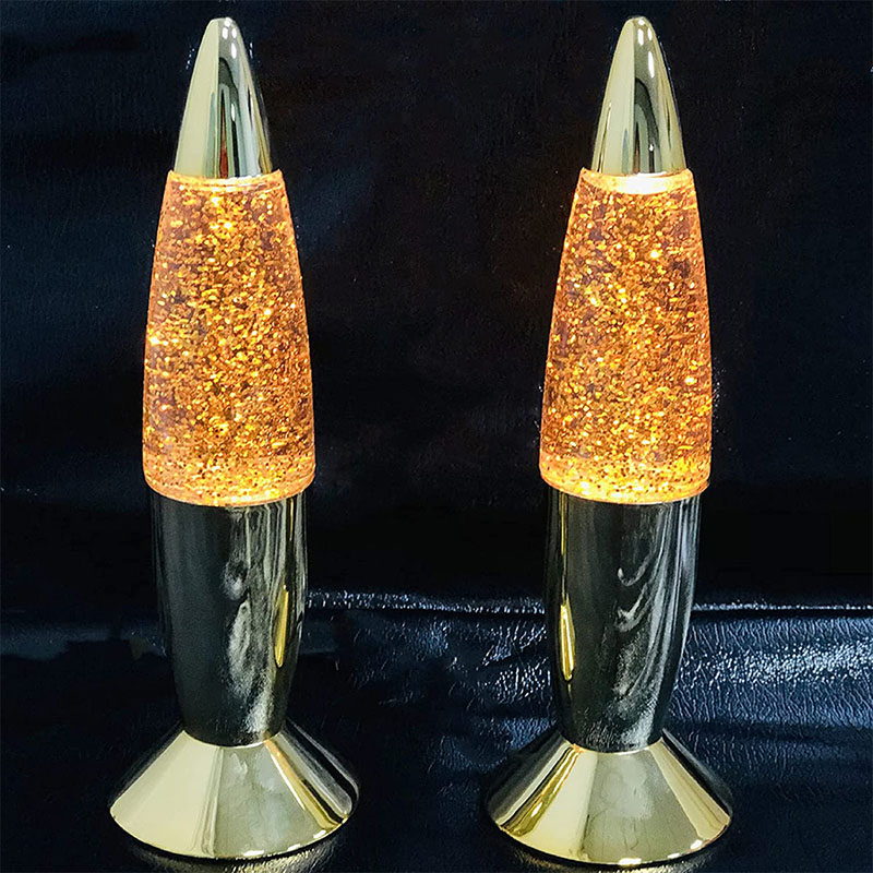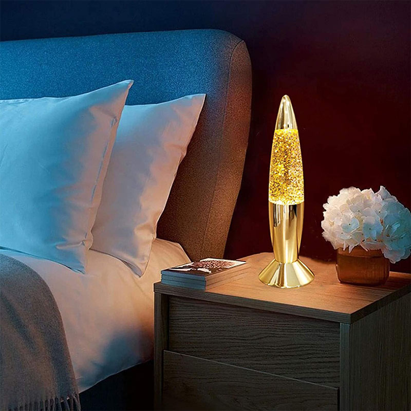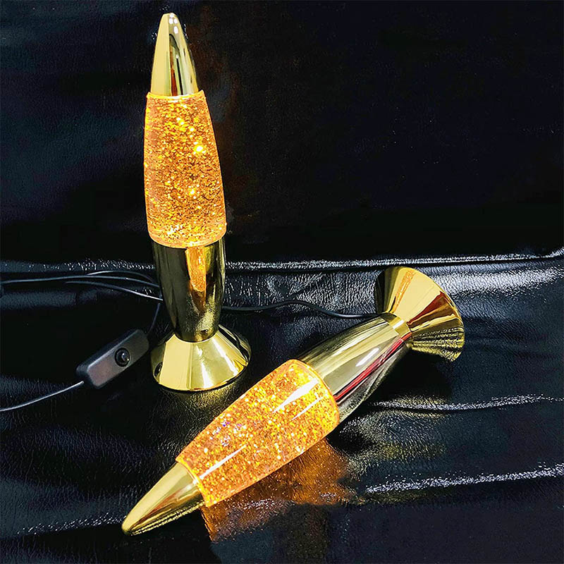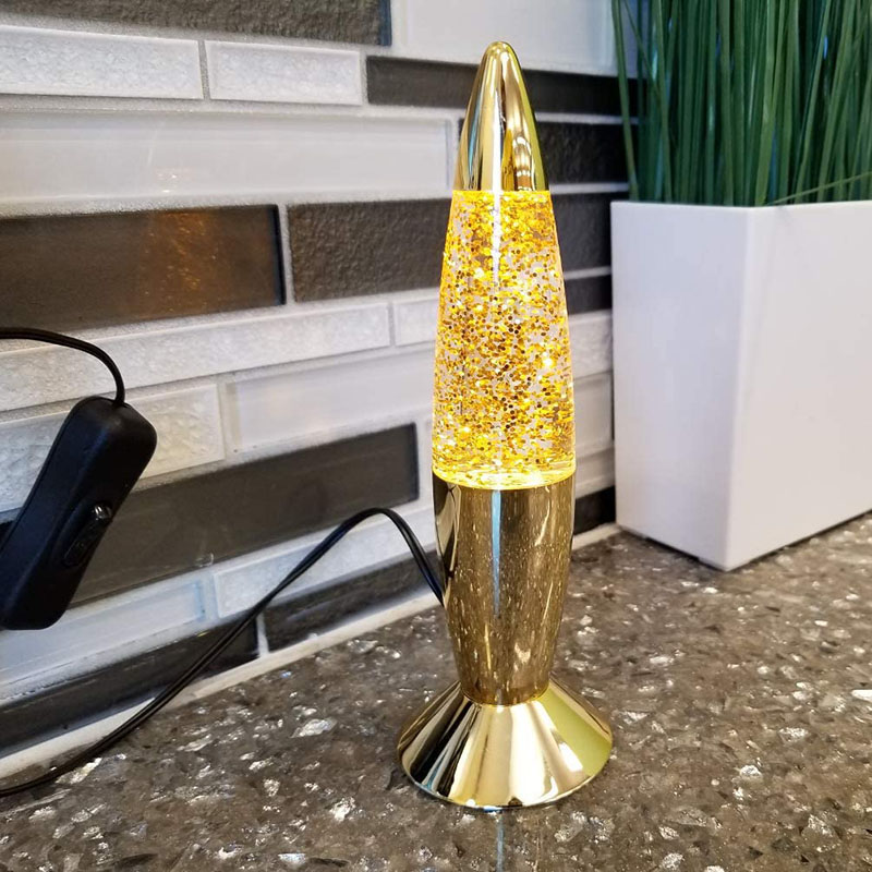 La lampada glitterata da 7 pollici ha del liquido all'interno della bottiglia. Il liquido si muove in modo irregolare dopo essere stato riscaldato. ci sono bottiglie di stile diverso in pollici e colore diverso.