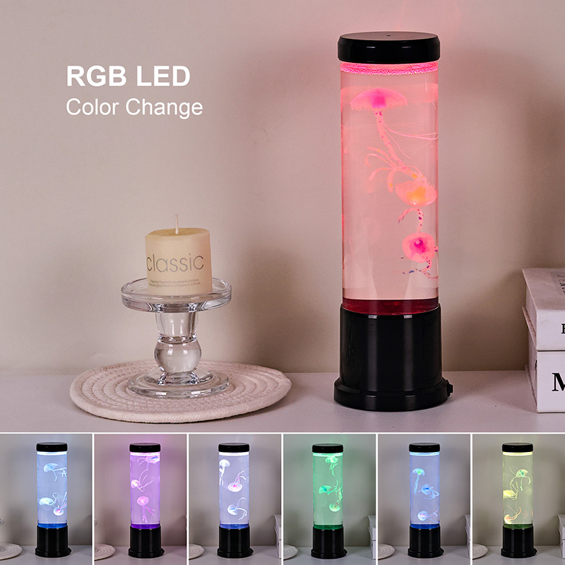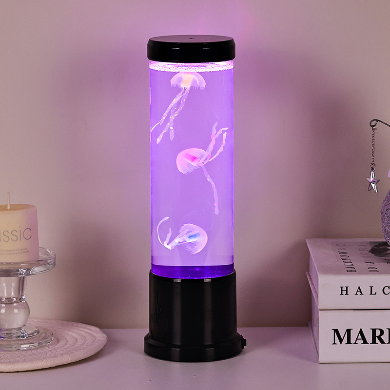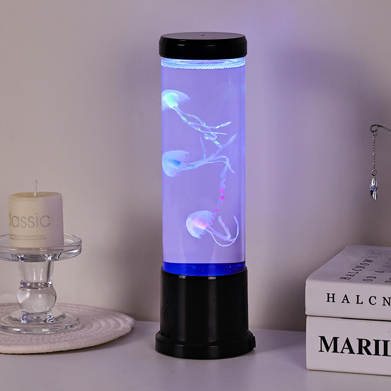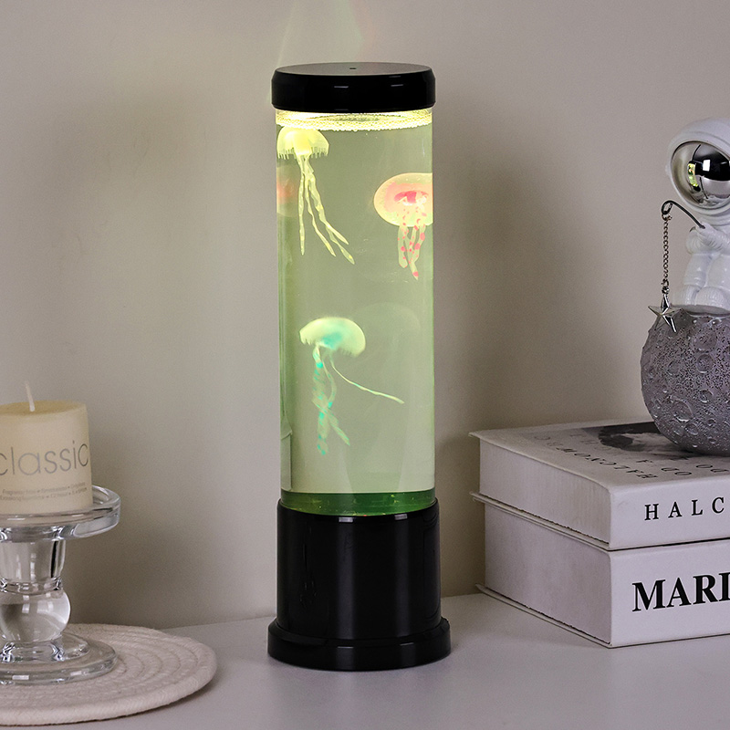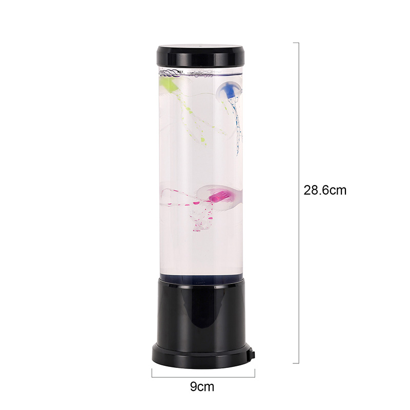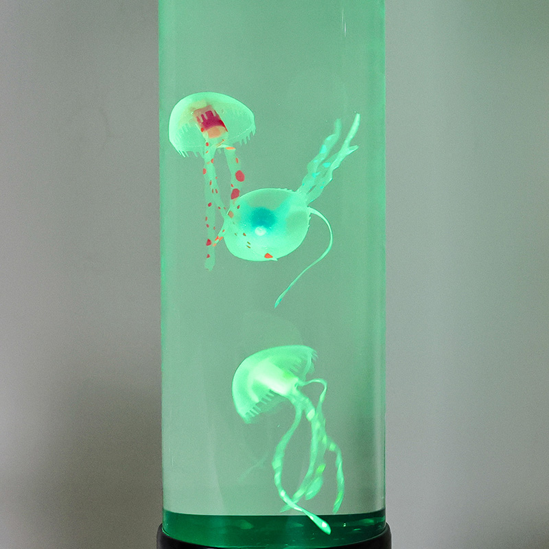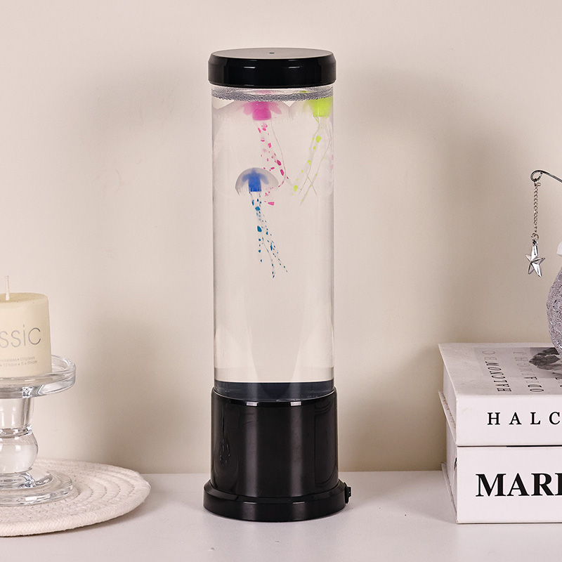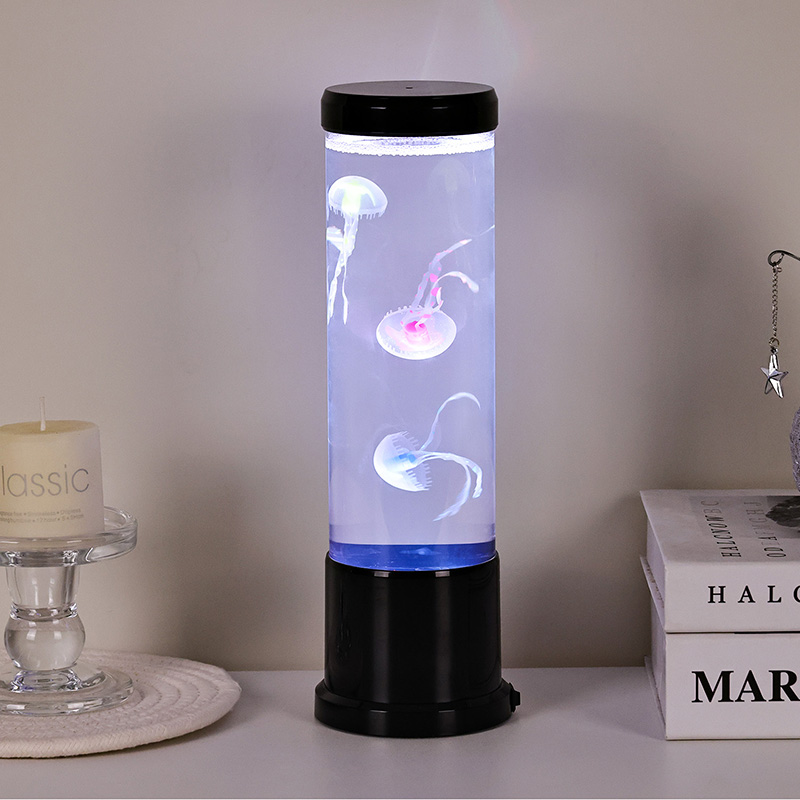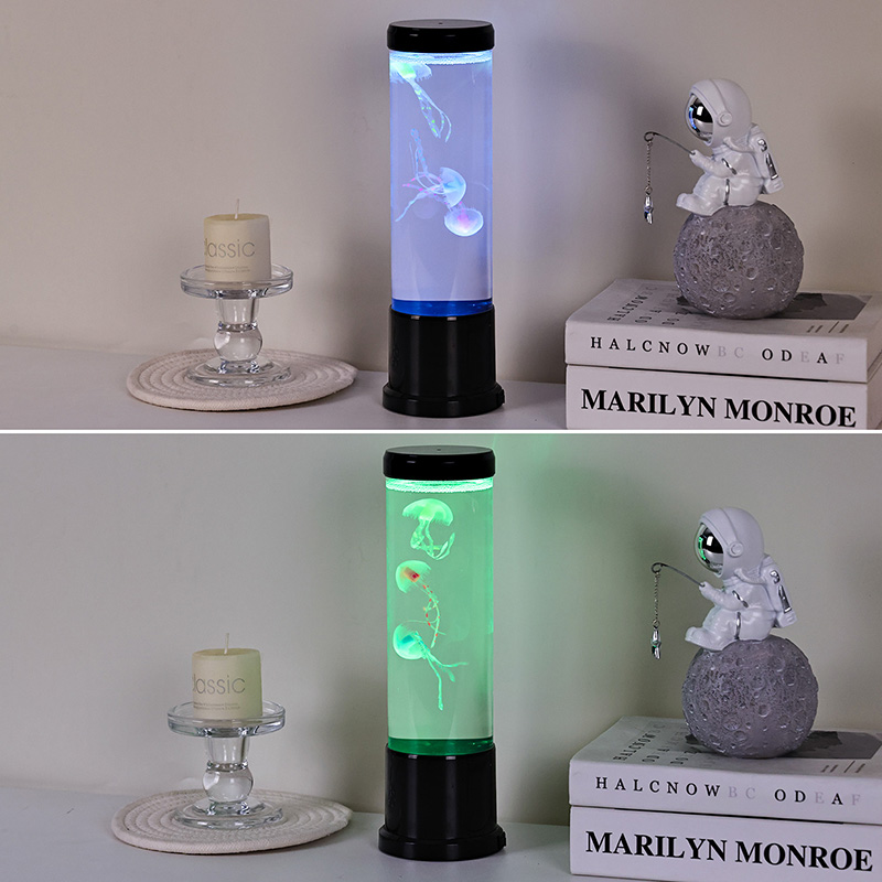 Il design elegante incontra l'ispirazione naturale La lampada a medusa a led di dimensioni elevate è caratterizzata da un cilindro alto e sottile realizzato in acrilico trasparente di alta qualità che consente una visibilità cristallina delle graziose meduse all'interno. Racchiuse in un morbido liquido blu, tre meduse realistiche galleggiano e pulsano delicatamente, i loro corpi traslucidi illuminati da luci LED multicolori dinamiche. Il delicato bagliore si sposta attraverso uno spettro di tonalità rilassanti, dal profondo blu e viola dell'oceano, al rosa tenue e al verde, imitando la bioluminescenza che si trova nei veri ambienti delle profondità marine. La parte superiore e la base della lampada sono rifinite in plastica nera lucida, conferendole un aspetto moderno e minimalista che si adatta a qualsiasi stile di arredamento.