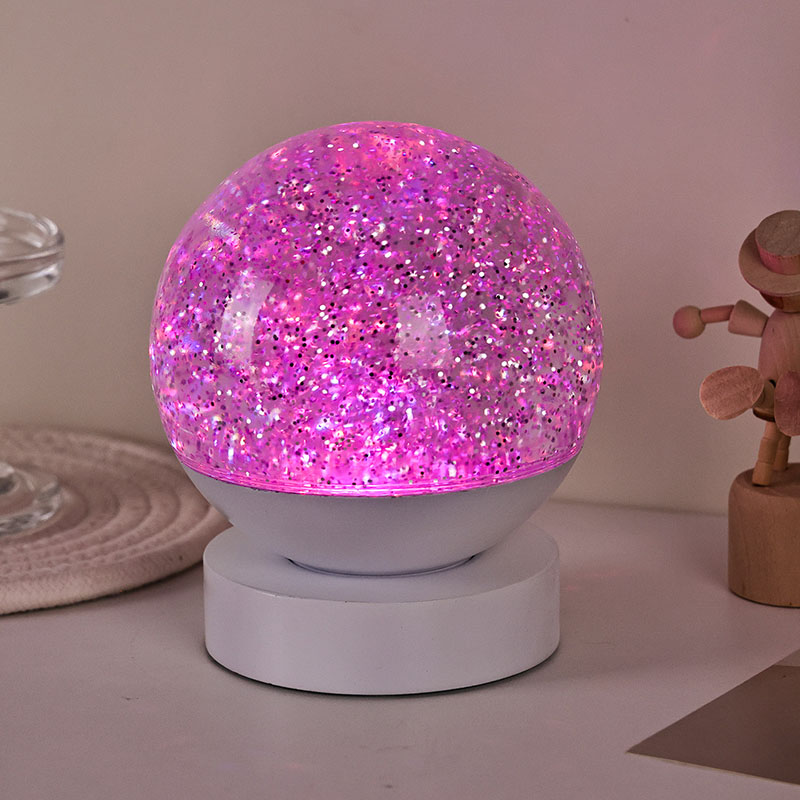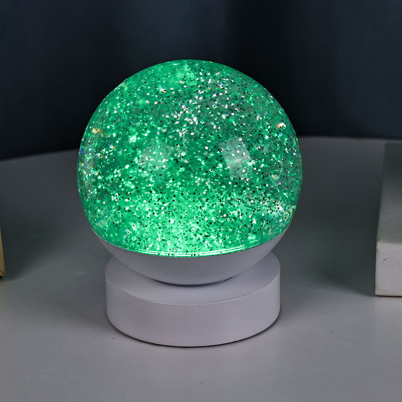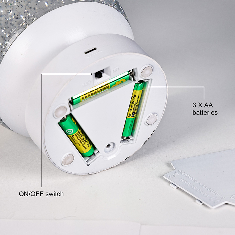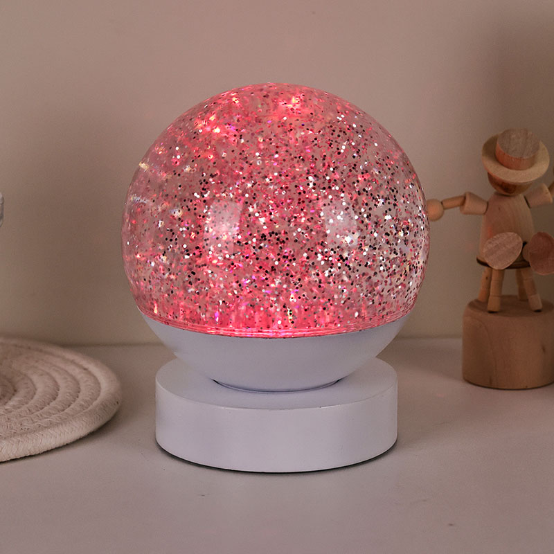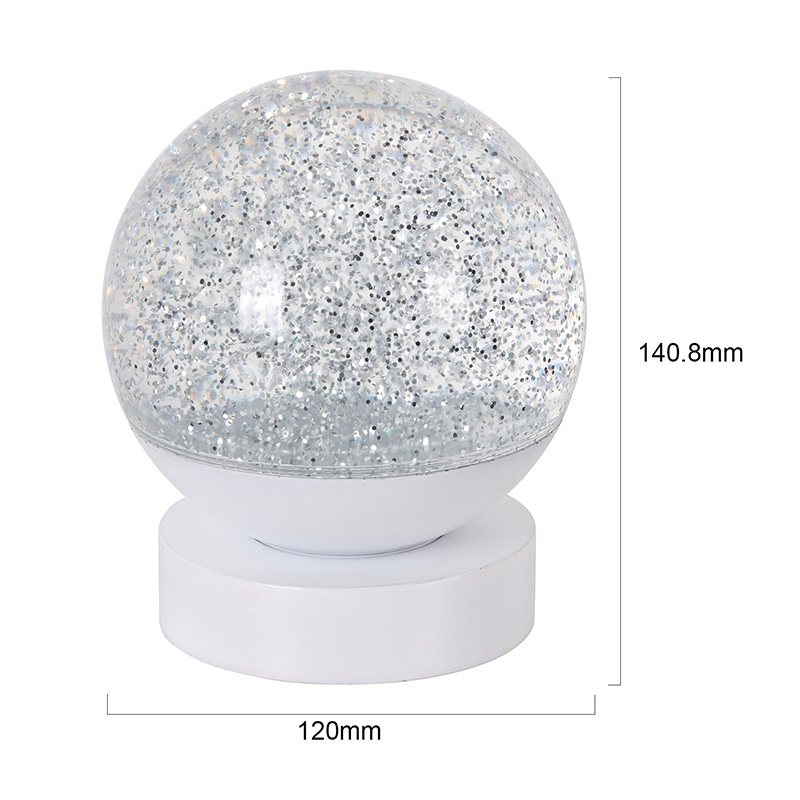 La lampada decorativa LED RGB Glitter è realizzata in materiale acrilico di alta qualità, caratterizzata da una sfera traslucida con un'eccellente trasmissione della luce. La base è realizzata in plastica ABS ecologica, garantendo stabilità, durata e sicurezza senza sostanze tossiche. Funziona con tre batterie AAA integrate (batterie vendute separatamente), eliminando la necessità di una presa di corrente e offrendo un utilizzo conveniente. Perfetto da posizionare accanto al letto, alla scrivania o nell'angolo dei giochi del bambino. Con un semplice interruttore touch, la luce può essere facilmente accesa o spenta, rendendola facile da usare anche per i bambini che possono operare in modo indipendente.