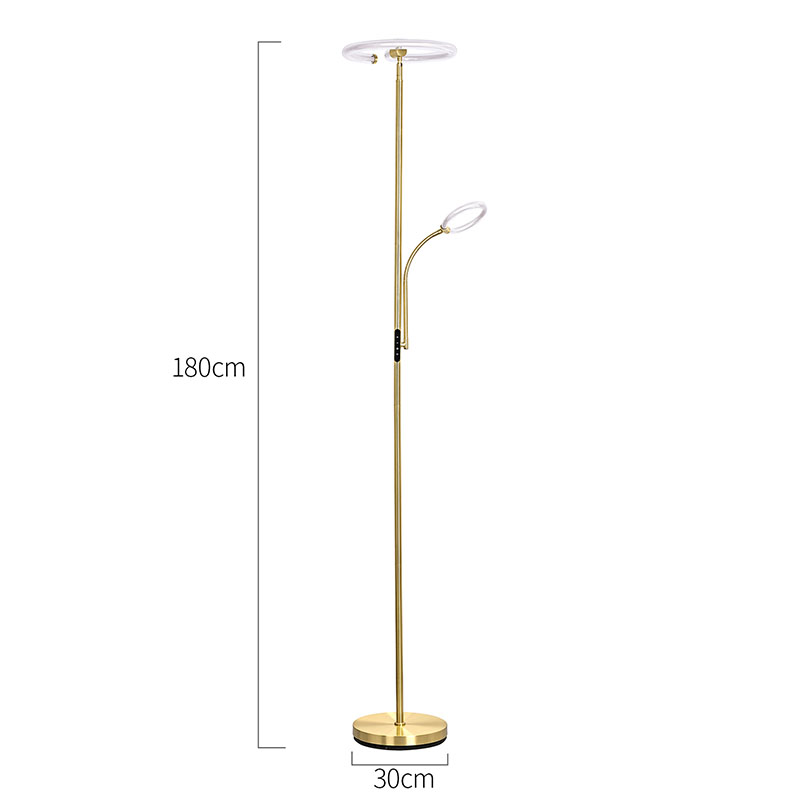 La lampada da terra a led Luxury Gold per soggiorno è realizzata in materiale metallico dorato di alta qualità, con un design generale semplice ma lussuoso. Il materiale metallico è stato finemente lucidato e trattato, con una superficie liscia e delicata e una morbida lucentezza, mostrando un'atmosfera nobile ed elegante. Sia collocato in soggiorno, camera da letto o