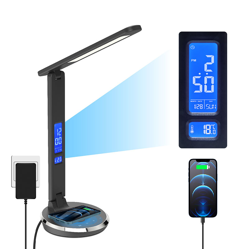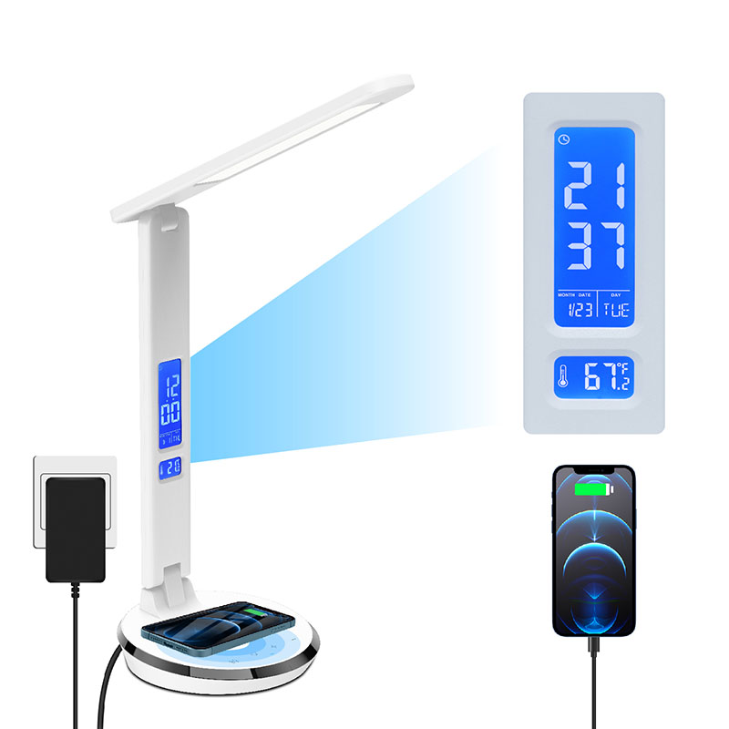 È presente uno schermo LCD con visualizzazione della temperatura, ora, sveglia, calendario perpetuo con il pulsante di controllo sul retro del corpo. E c'è una porta di ricarica USB dietro il paralume della lampada da scrivania.