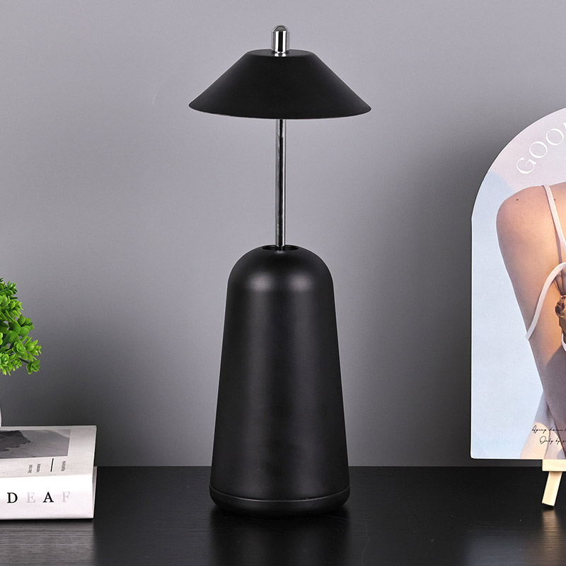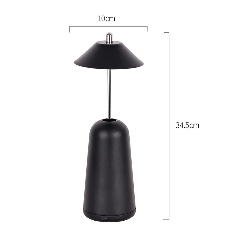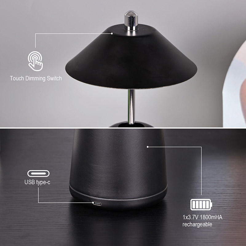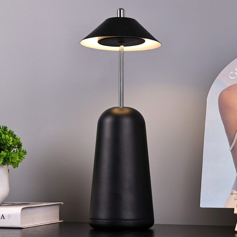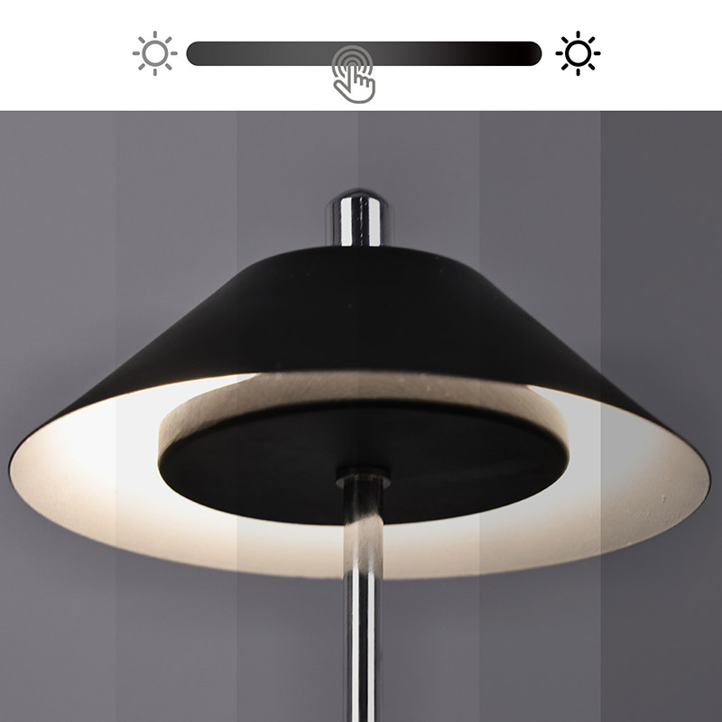 La luce della moderna lampada da scrivania a Led con paralume regolabile è tagliata internamente nel paralume, con colori caldi e tre livelli di intensità luminosa che vanno da 3000K a 6500K. La parte superiore del paralume è un interruttore tattile, simile ad un'antenna. La base è composta da metallo cilindrico irregolare