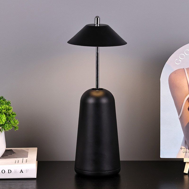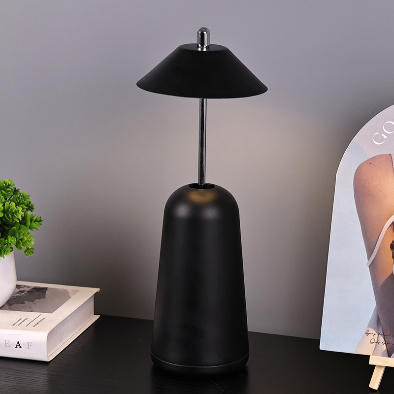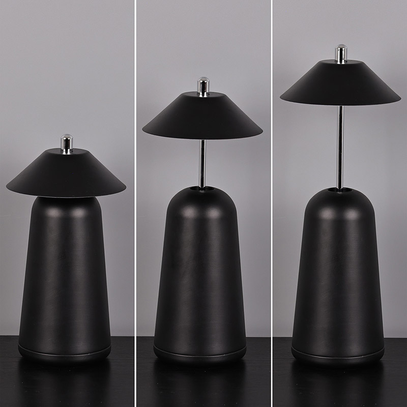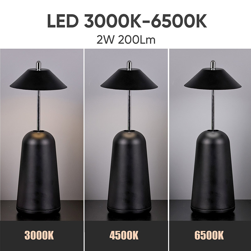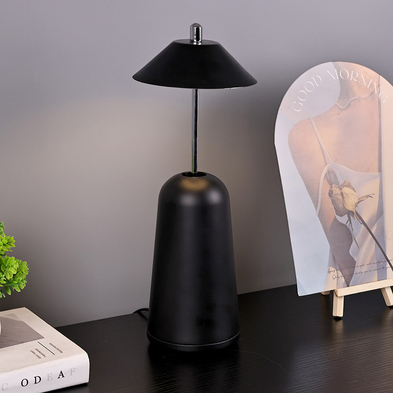 La luce della moderna lampada da scrivania a Led con paralume regolabile è tagliata internamente nel paralume, con colori caldi e tre livelli di intensità luminosa che vanno da 3000K a 6500K. La parte superiore del paralume è un interruttore tattile, simile ad un'antenna. La base è composta da metallo cilindrico irregolare