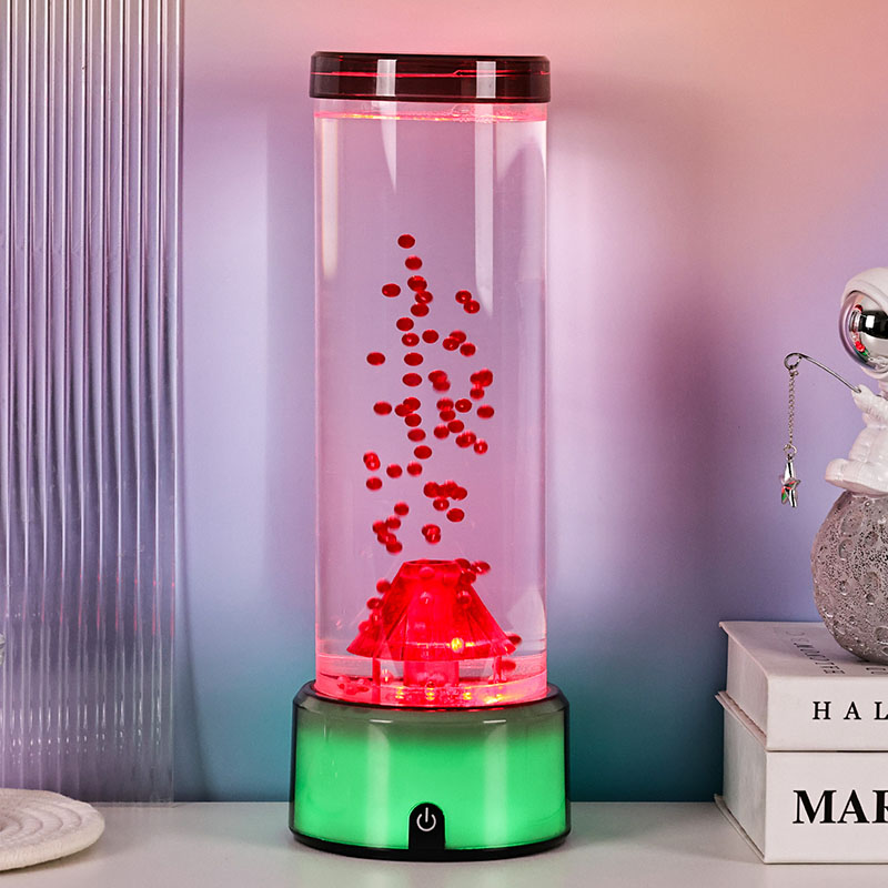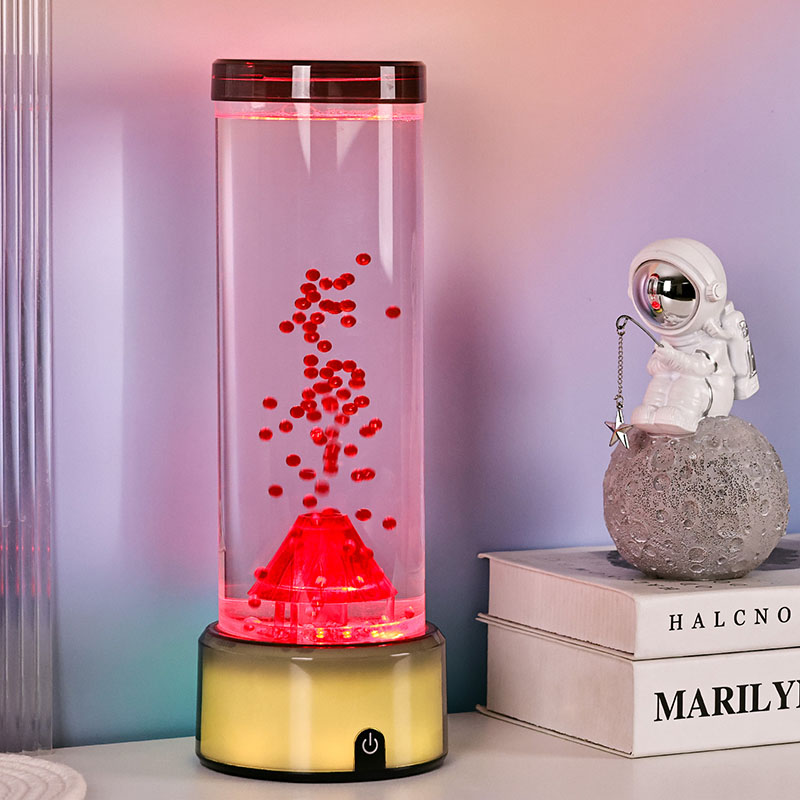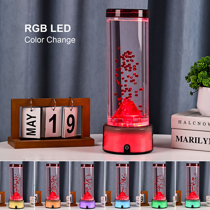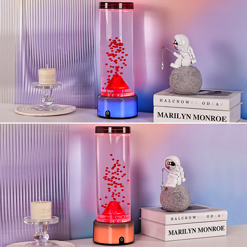 Progettata con meticolosa attenzione ai dettagli, questa lampada LED a forma di vulcano presenta una camera liquida cilindrica riempita di fluido trasparente e particelle rosse fluttuanti che simulano un'eruzione vulcanica quando attivate. La base della lampada si illumina di vivaci luci RGB che cambiano colore, mentre la struttura centrale del vulcano pulsa di un'illuminazione ardente, imitando una vera eruzione. Allo stesso tempo, delicate decorazioni simili a meduse fluttuano con grazia all'interno della colonna liquida, aggiungendo un'atmosfera subacquea surreale. Insieme, questi elementi creano uno spettacolo visivo affascinante che combina la potenza della natura con l'eleganza del design moderno. Design e fascino estetico La lampada Vulcano che cambia colore RGB è alta circa 12 pollici, rendendola ideale per il posizionamento su scrivanie, comodini, scaffali o come sorprendente pezzo decorativo in soggiorni, camere da letto o persino aule. La sua silhouette elegante e moderna è caratterizzata da un tubo cilindrico trasparente realizzato in plastica infrangibile di alta qualità, che garantisce durata e sicurezza. Il coperchio superiore è sigillato saldamente per evitare perdite, mentre la base è realizzata in plastica liscia con finitura opaca e dispone di un pannello di controllo integrato.