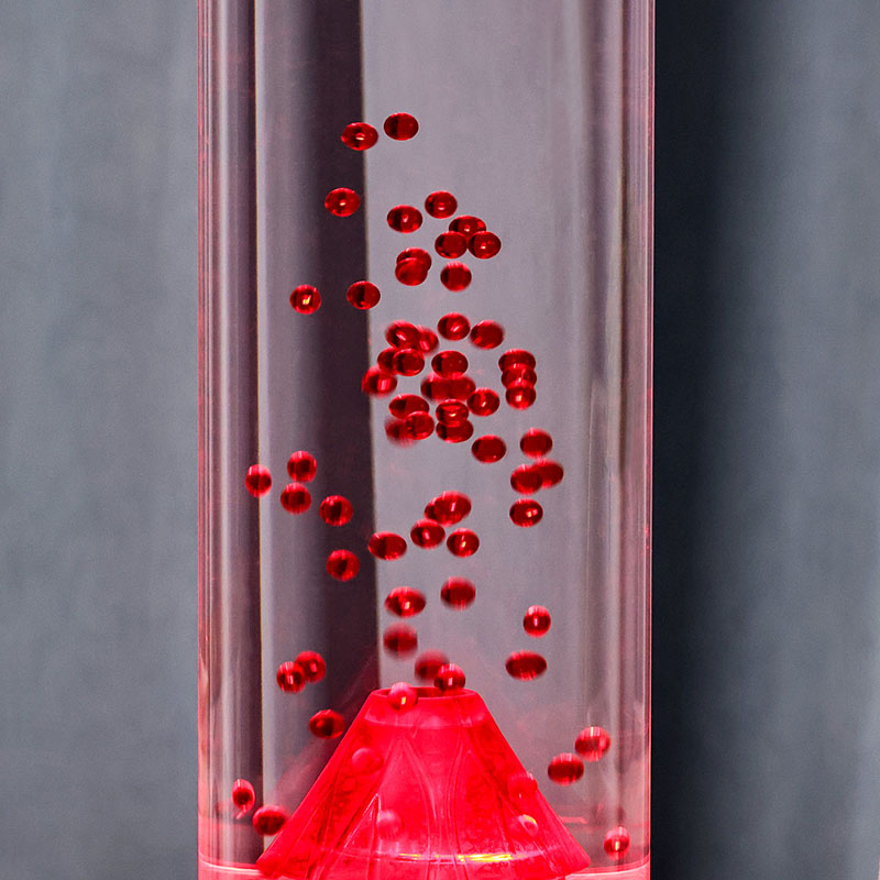 Al centro della lampada si trova un modello di vulcano in miniatura, progettato in modo intricato per assomigliare a un vero cono vulcanico. Quando viene acceso, il vulcano inizia a “eruttare”, inviando particelle di colore rosso verso l’alto attraverso la colonna di liquido in un movimento continuo e ritmico. Queste particelle, sospese in un liquido atossico appositamente formulato, salgono e scendono come bolle di lava, creando un effetto ipnotico che ricorda un vulcano attivo. Il movimento è azionato da un piccolo sistema di pompa interna, che fa circolare il liquido in modo delicato ma costante, garantendo prestazioni durature senza surriscaldarsi.