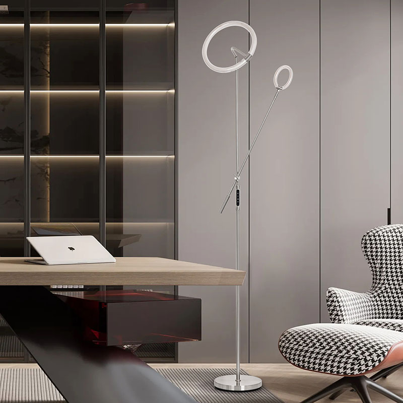 Il design dell'illuminazione ambientale non solo conferisce alle lampade un effetto visivo unico, ma diffonde anche efficacemente la luce, rendendola più morbida e uniforme. Il lampione e la base di questa lampada da terra sono stati finemente lucidati e trattati, con una superficie liscia e delicata e una sensazione confortevole al tatto.