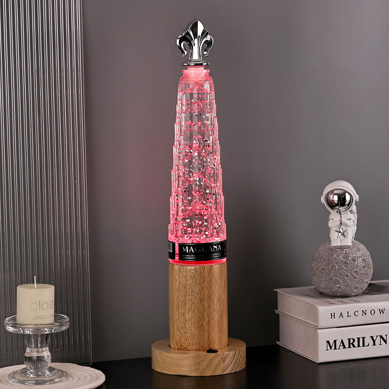 I glitter, azionati da un piccolo motore, fanno sì che il liquido si muova in modo irregolare, riversandosi come una cascata, creando un effetto visivo dinamico